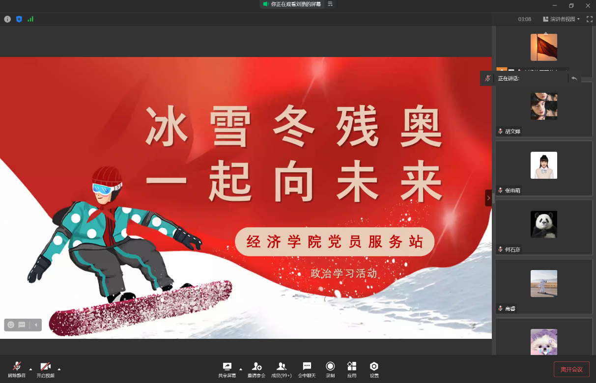 2022年3月13日,北京冬残奥会闭幕式在北京国家体育场“鸟巢”如期举行,历时九天的“冰雪之约”就此划上了圆满的句号。为了弘扬“勇气、毅力、激励、平等”的残奥价值观,使同学们进一步感受到来自残奥运动员身上所具备的拼搏精神和顽强意志,3月18日经济公司党员服务站通过线上直播的形式举办了“冰雪冬残奥,一起向未来”政治学习活动。本次活动涵盖面广,共有18至21四个年级250位站员参加。活动由20级贸经一班的姚奕主持。
