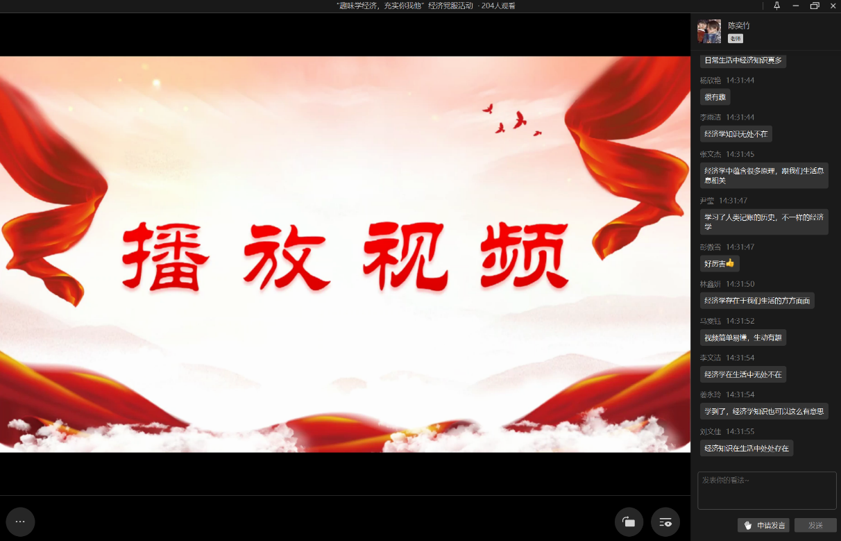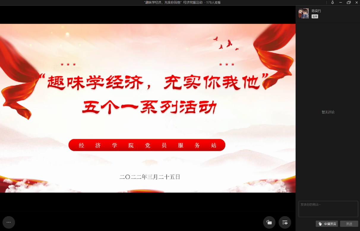 “惟有对外界事物抱有兴趣,才能保持人们精神上的健康”,兴趣是最好的老师,当我们对学习产生兴趣后,学习就变成了一种享受。为了让同学们在轻松愉悦的环境中学习经济学知识,更加深切地体会到经济学所蕴含的独特魅力,3月25日下午,经济公司党员服务站通过线上直播的形式举办了“趣味学经济,充实你我他”五个一系列活动。本科生与研究生共计200位站员参加了本次活动,活动由20级国贸三班的陈奕竹主持。