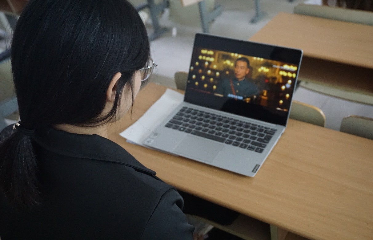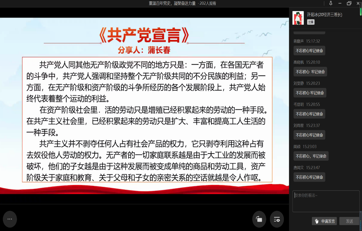 (图为20级国贸二班的蒲长春同学为站员们作《共产党宣言》分享的活动截图,张子璇摄)