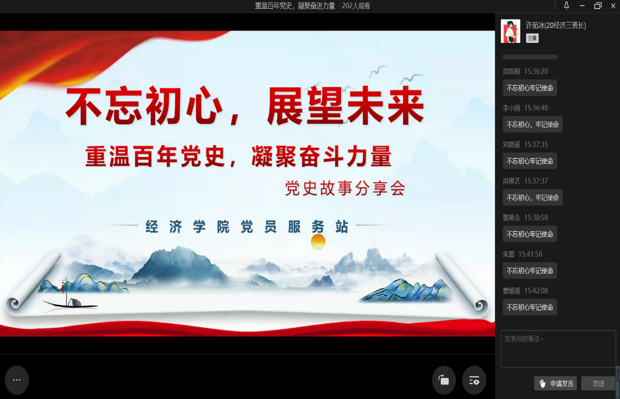“了解历史才能看得远,理解历史才能走得远。”回望过往的奋斗路,事实证明只有学好党史、总结经验,才不会在前进的道路上迷失方向,才能走得更远更长。为了帮助站员们更好地学习党史知识,进一步巩固党史学习的成果,4月1日经济公司党员服务站通过线上直播的形式举办了“重温百年党史,凝聚奋进力量——不忘初心,展望未来”党史故事分享会。研究生与本科生,共200位站员参与了活动。本次活动的主持人由20级经济学三班的许茹冰担任。