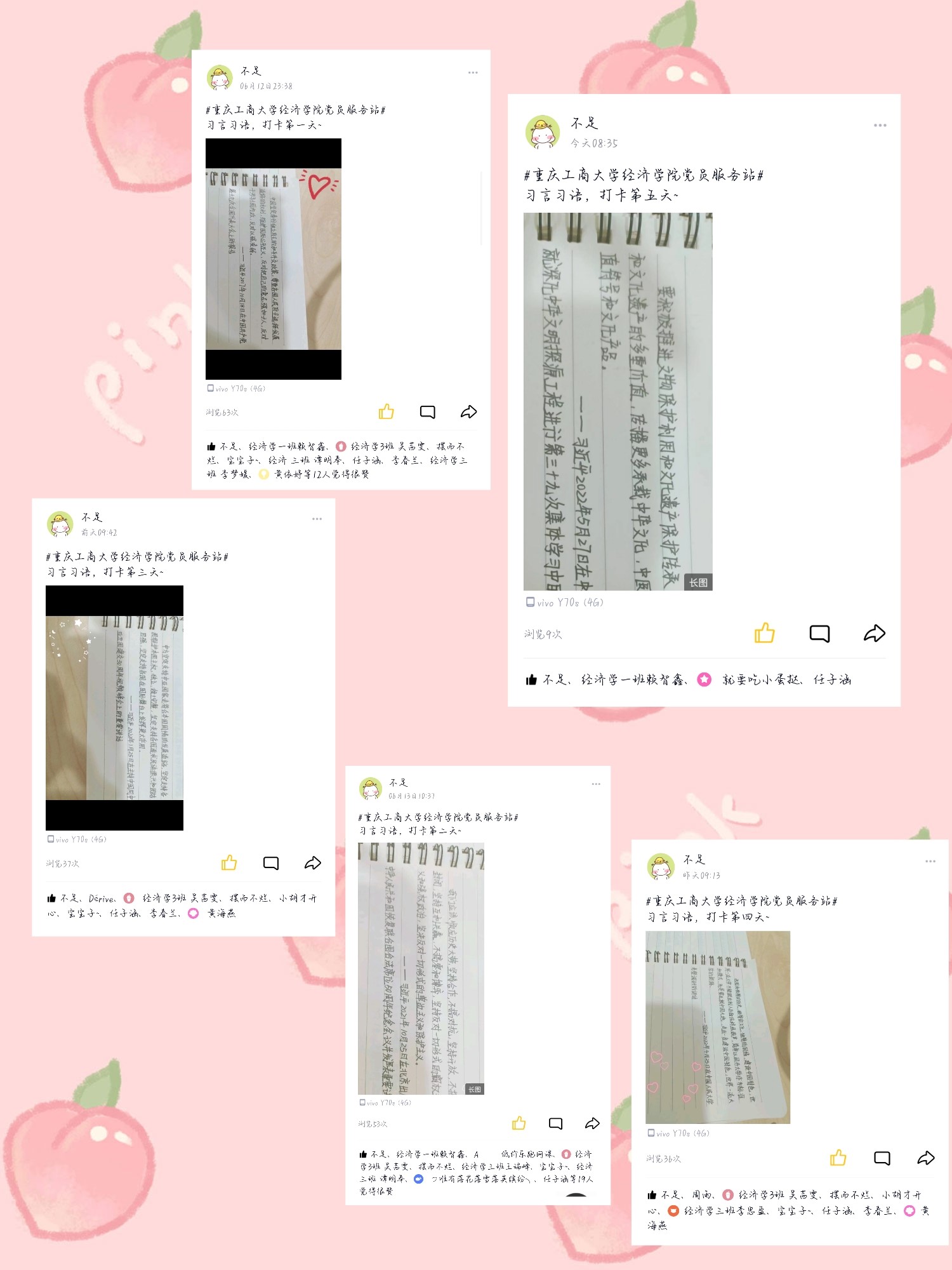 “心有所信,方能行远”。面对未来未知的变化与挑战,广大青年学子需要坚定理想信念、矢志拼搏奋斗,接过历史的接力棒,走好新时代的长征路。在此希冀下,经济党服面向全院举办的“学习新思想,争做新青年”打卡活动,引导了站员们运用马克思主义立场、观点、方法观察分析问题,坚定正确的政治方向,增强道路自信、理论自信、制度自信、文化自信,坚定听党话、跟党走的人生追求。作为勇立时代潮头的新青年,经济学子应当握好人生之门的钥匙,始终保持积极向上的精神状态,忠于祖国,志存高远,练就过硬本领,坚守高尚品格,顺应时代潮流,充分展现青年一代拼搏进取的人生姿态!