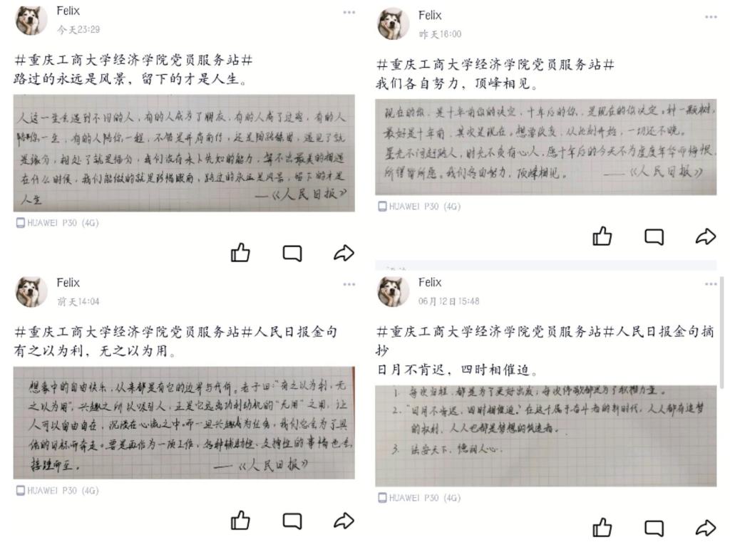 活动过程中,站员们每日摘抄符合社会主义核心价值观的金句学习最新思想,关注国家新动向,并通过在QQ空间拍照打卡的方式提高自身的文化素养、劳动素养、培养健康生活观念,促进全面发展,充分体现了“学习新思想,争做新青年”的活动主旨,在接受自我教育的过程中个人的思想水平也得到了进一步的提升。其中,站员们的摘抄内容包括“习言习语”习近平总书记的经典讲话,人民大众喜闻乐见的《人民日报》金句,以及饱含深情的爱国诗歌……一言一词尽蕴含远大理想,一字一句皆坚定理想信念,正是这点点滴滴的信念构成了中华民族伟大的精神谱系与思想丰碑,正因感受到了新时代伟大思想与使命的激励和号召,中华民族伟大复兴的梦想牢牢根植于每一位新青年的心中。