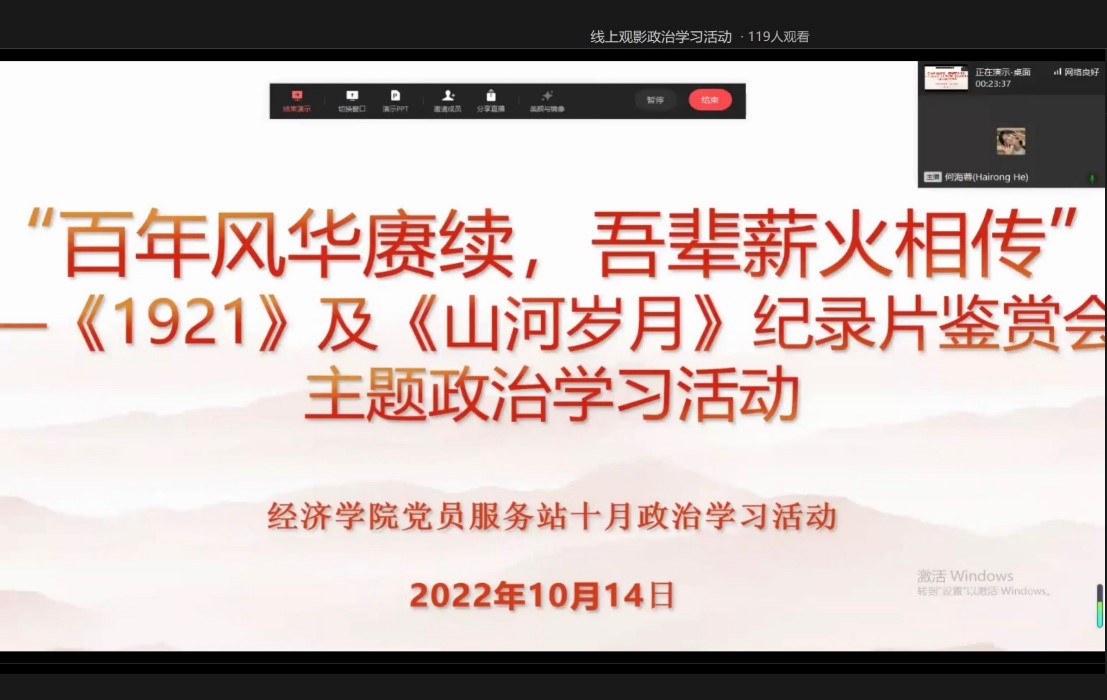 “百年征程波澜壮阔,百年初心历久弥坚。”为纪念中国共产党成立101周年,深入贯彻习近平总书记在庆祝中国共产党成立100周年大会上的讲话精神,进一步增强同学们的爱国主义精神和民族自豪感,10月14日下午,经济公司党员服务站举办了“百年风华赓续,吾辈薪火相传”——《1921》及《山河岁月》纪录片鉴赏主题政治学习活动,活动由21级国贸一班何海蓉同学主持。