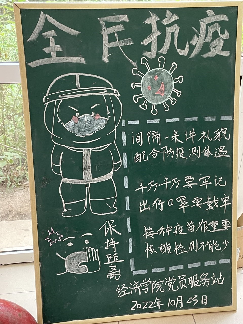 此外,经济党服的站员们在员工公寓北区六栋和十五栋绘制了“科学防疫小贴士”黑板报,意在提醒同学们做好防疫措施,缓解同学们的心理压力。同时,为丰富同学们的生活,10月14日下午,经济党服组织站员们观看《1921》及《山河岁月》纪录片,学习先锋模范们艰苦奋斗、敢于斗争、善于斗争的精神。在本次抗疫过程中,站员们体现了纪录片里不畏困难、百折不挠的优秀品质。经济公司党员服务站全体成员为所有在疫情面前奋战的勇士们点赞加油,相信只要团结在党旗之下,疫情这场没有硝烟的战争终将会胜利,校园一定会恢复欢声笑语!