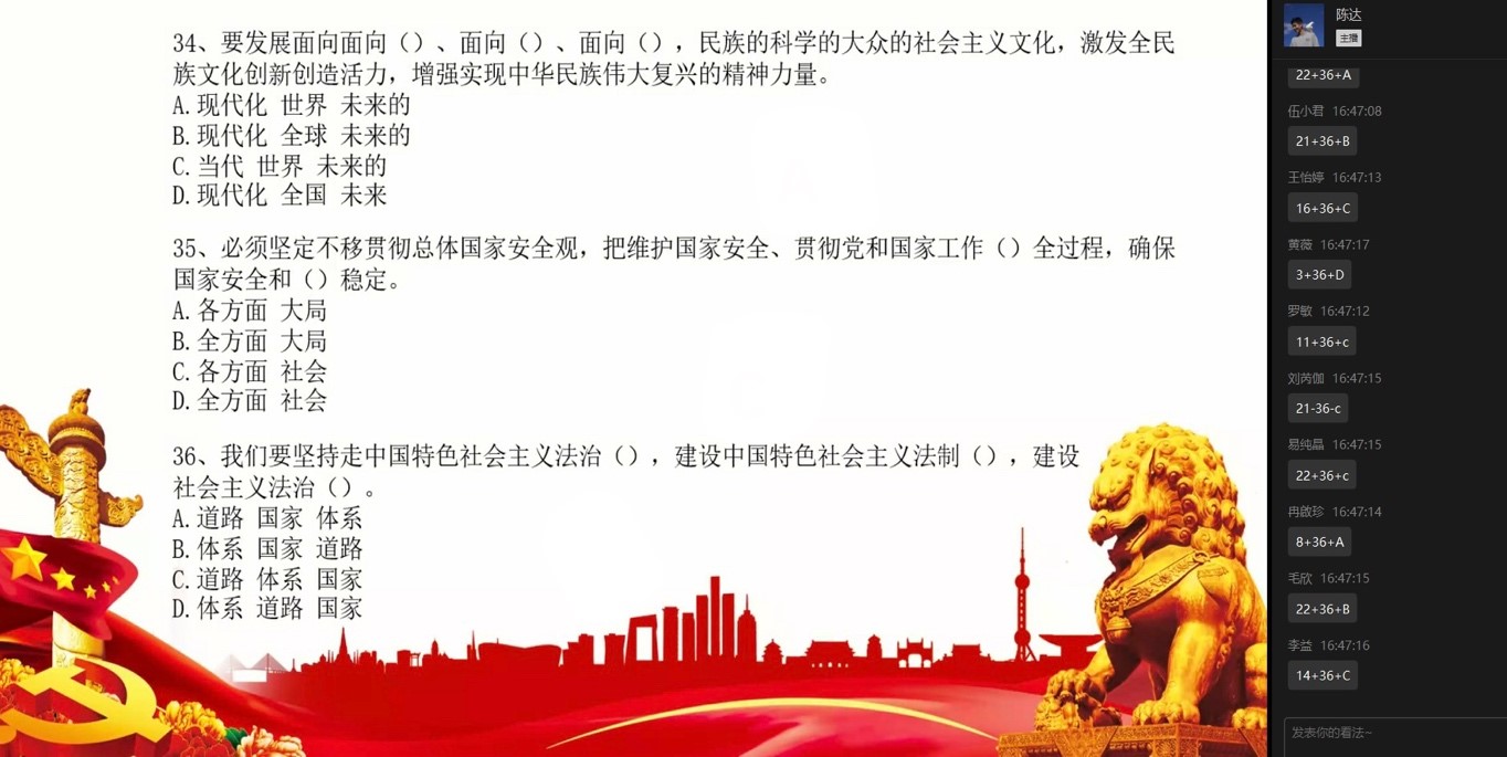 16时30分,本次活动以线上直播的方式准时拉开序幕。在开始抢答之前,主持人为站员们讲解此次抢答环节的比赛规则,并播放短片《请党放心,强国有我——一分钟看完百年党史》。视频播放结束后,主持人发布党史问题并宣布抢答开始。各小组同学在评论区积极抢答,展现自己的党史学习成果。经过近一小时紧张激烈的角逐,线上抢答结束,工作人员统计各组得分情况并由主持人公布最终成绩。其中获得一等奖的小组代表——21级经济学三班骆玉钦同学分享了活动感言:“很高兴我们小组能够获得此次知识竞赛的一等奖!自二十大召开以来,组员们密切关注着党过去的发展成果及各项政策要求,认真完成学习强国相关内容,为赢得这次比赛奠定了基础。我们全组衷心祝贺本次活动的顺利举办,希望各位同学再接再厉,为党的建设做出自己的贡献!”最后,主持人致结束语,此次活动圆满结束。