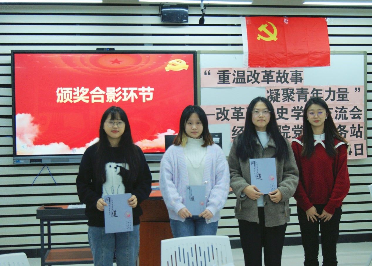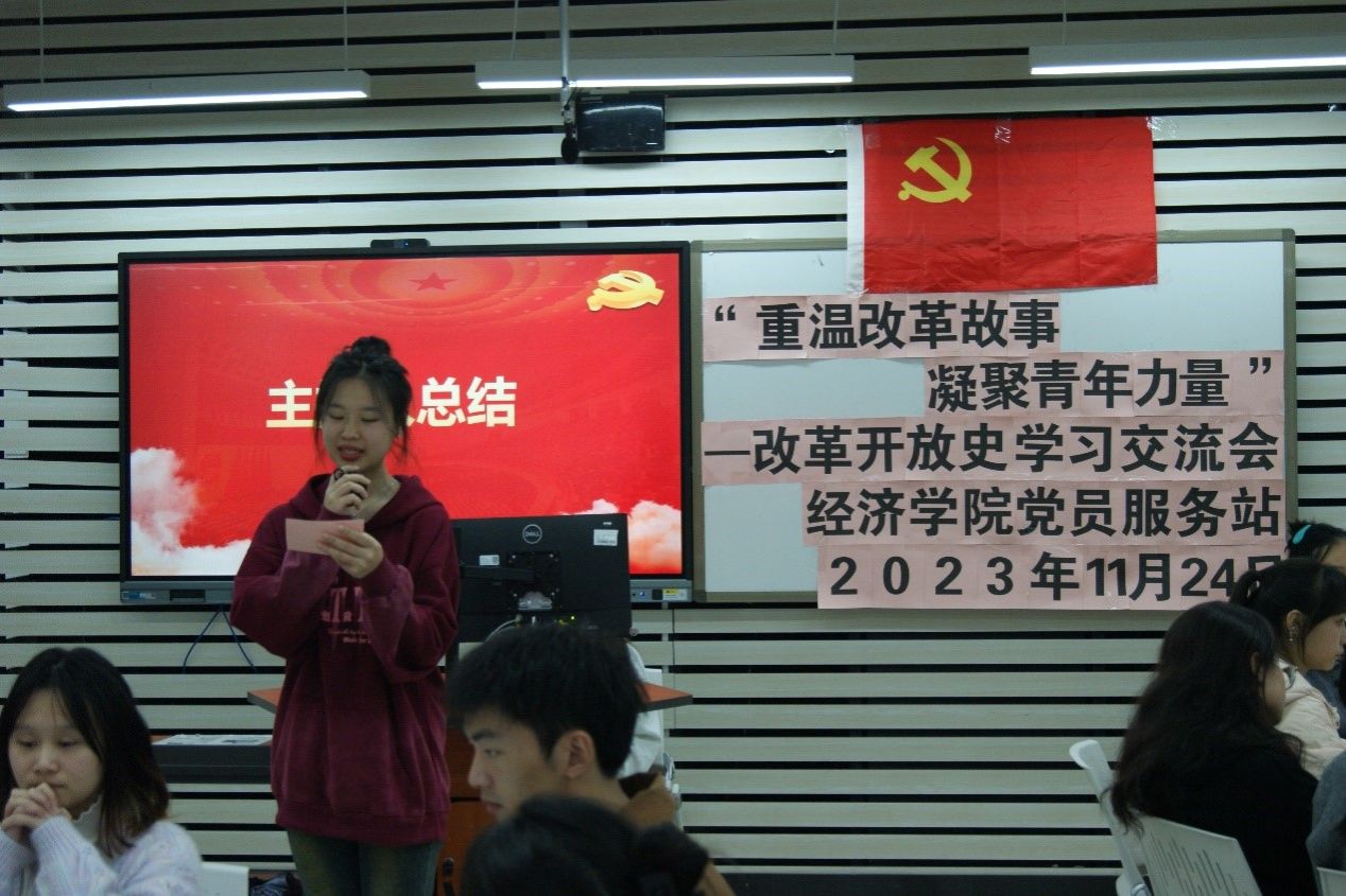 改革开放是中国人民用智慧和勇气书写的一部壮丽的中国故事,当代青年更是改革开放的见证者、亲历者、和继承者,肩负着实现中华民族伟大复兴的历史使命。为了让同学们进一步感悟改革开放的伟大精神,经济公司党员服务站于11月24日在涵智楼120910举办了“重温改革故事,凝聚青年力量”——改革开放史学习交流会。本次活动由22国贸一班卢笛雅同学主持,共50余名站员参与。
