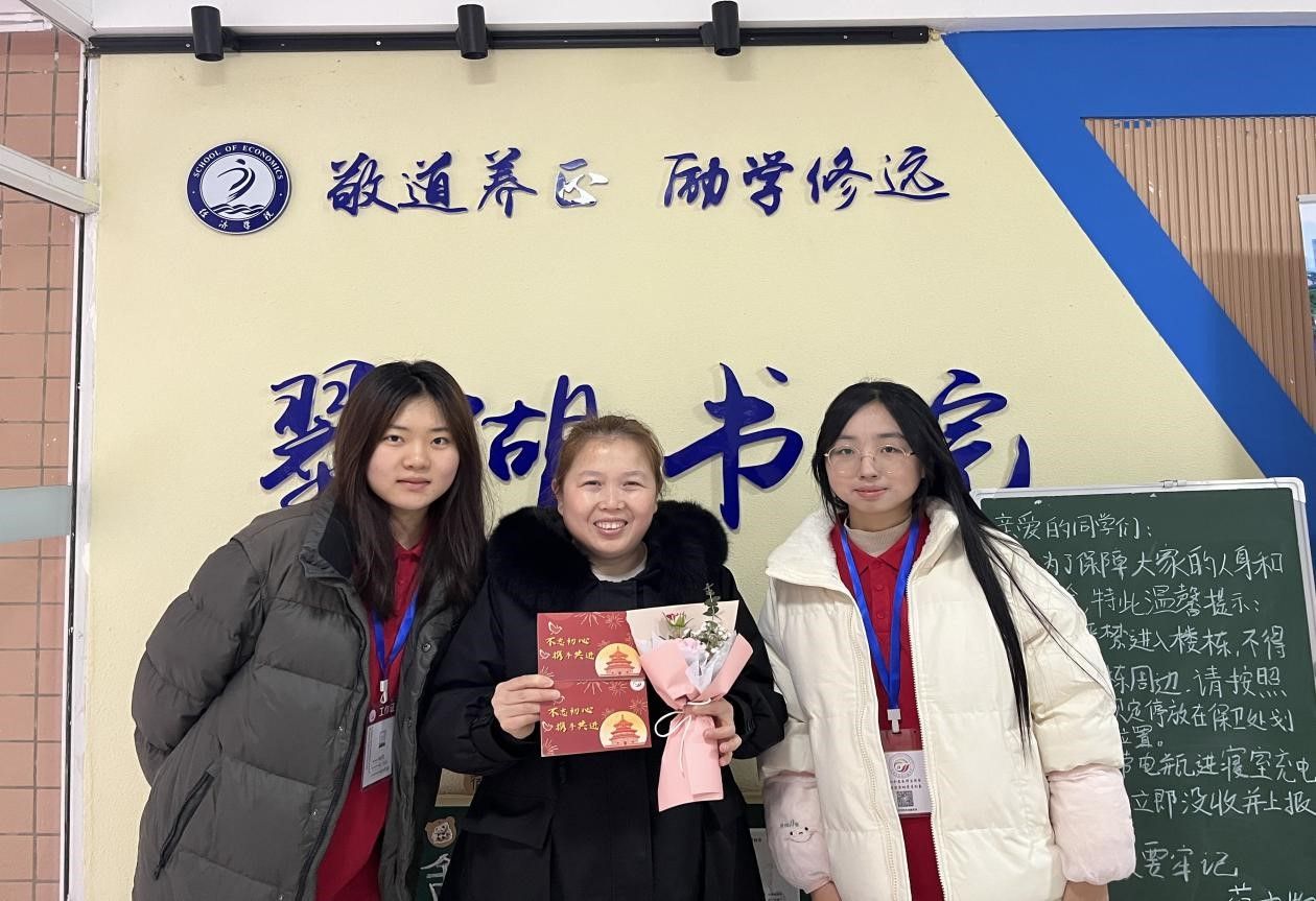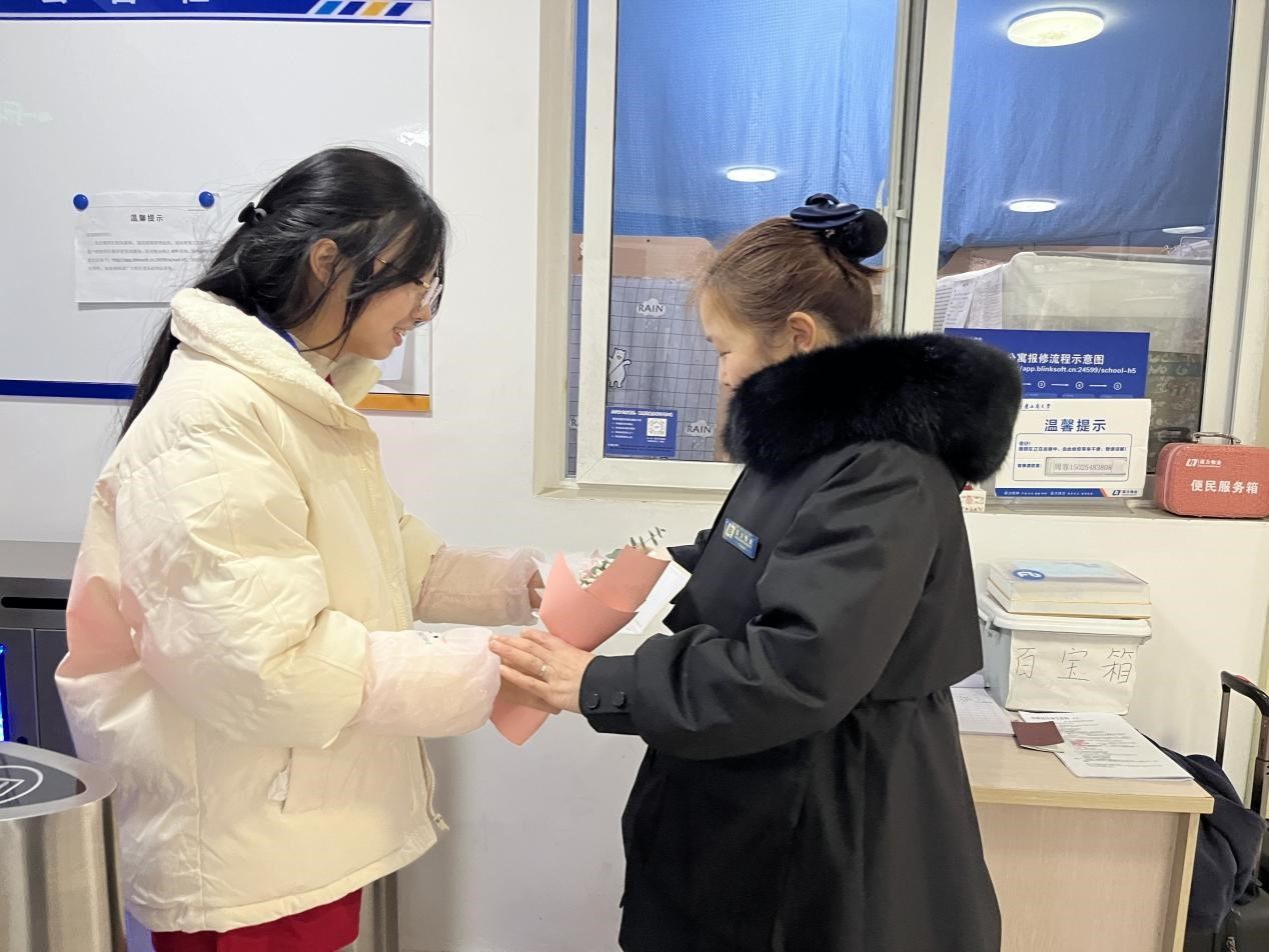 迟日江山丽,春风花草香。在这个草木蔓发、春山可望的美好时节,我们迎来了节日——三八国际劳动妇女节。为感谢各楼栋宿管阿姨们在工作中的无私奉献,真挚表达经济学子对宿管阿姨的尊敬之情,经济公司党员服务站部门负责人为宿管阿姨们送去鲜花和贺卡,向在岗位上付出辛勤劳动的她们予以节日的祝福和问候。