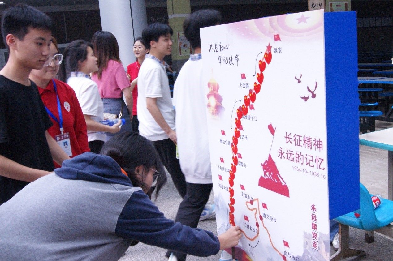 下午16时15分,同学们开始入场,并通过在长征路地图上粘贴红心进行签到。随后,主持人介绍本次活动的背景和稍后寻宝规则并带领同学们开展英雄人物猜图热场小游戏,抢答过程中同学们踊跃举手,现场气氛逐渐攀升,点燃了参与活动的热情。