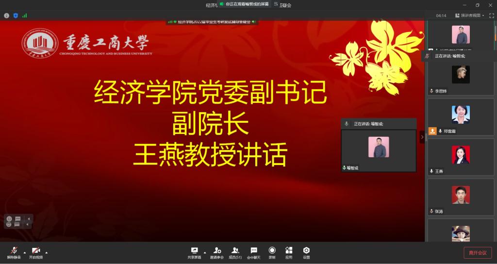 为做好2022届毕业生考研复试指导服务,助力学子成功升研,3月10日上午10点举办了线上线下“2022届毕业生考研复试辅导答疑会”。伟德国际bevictor1946副书记副经理王燕教授,财税系尚可文教授,及65名毕业生参加了线上会议;贸易经济系主任杨海丽老师,毕业班辅导员喻智成老师及10名考研学子参加了线下会议。