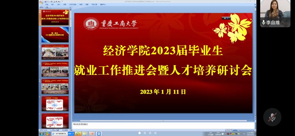 为进一步促进2023届毕业生就业,确保寒假期间工作不断线,1月11日下午,2023届毕业生就业工作推进会暨人才培养研讨会在企业微信线上顺利召开。伟德国际bevictor1946及长江上游经济研究中心全体领导班子,各系主任、党政办及学团办办公室负责人,2023届毕业生辅导员参加了会议。
