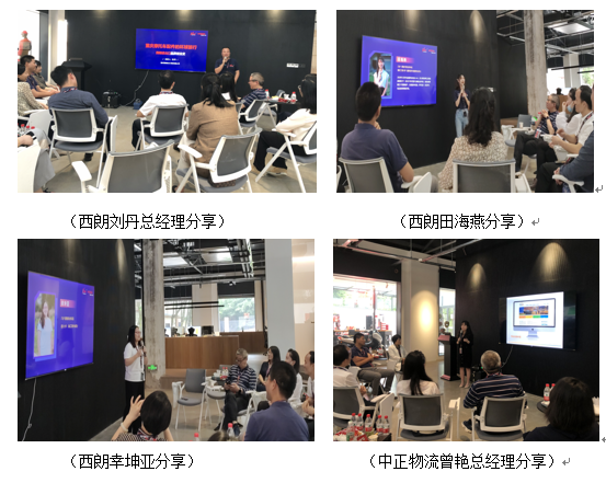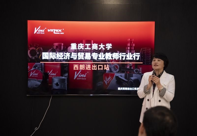随后,国贸系教师团队与西朗进出口贸易公司进行了分享交流会。交流会由国贸专业2022届优秀毕业生、西朗入职实习生郭伶俐主持。分享交流主题从四个方面进行:首先,公司创始人刘丹以“重庆摩托车配件的环球旅行——西朗进出口品牌创业史”为题,分享了他们年轻时的外贸梦想和西朗“VINI”品牌海外成长故事,与国贸系老师们共勉;然后,田海燕给老师们分享了她从国贸学子变身高级外贸业务专员的成长过程及心路历程;接着,西朗营销总监幸坤亚结合西朗的外贸实践从品牌代理商和代工两种外贸模式下对外贸业务员应当具备的能力需求,给出了西朗公司的人才画像;最后,特邀嘉宾-西朗重要合作货代公司,中正物流集团曾艳总经理分享了重庆陆海空货运通道,以及货代的业务流程。