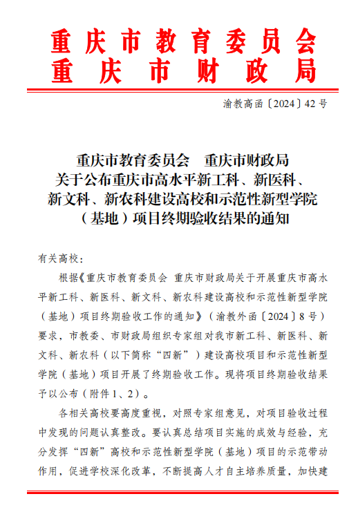 近日,重庆市教育委员会依据《重庆市教育委员会 重庆市财政局关于开展重庆市高水平新工科、新医科、新文科、新农科建设高校和示范性新型公司(基地)项目终期验收工作的通知》(渝教外函〔2024〕8号),正式揭晓了重庆市普通本科高校基础学科人才培养示范基地的验收成果。公司经济学拔尖人才培养示范基地凭借卓越表现,荣获“优秀”评定,顺利通过市教委验收。