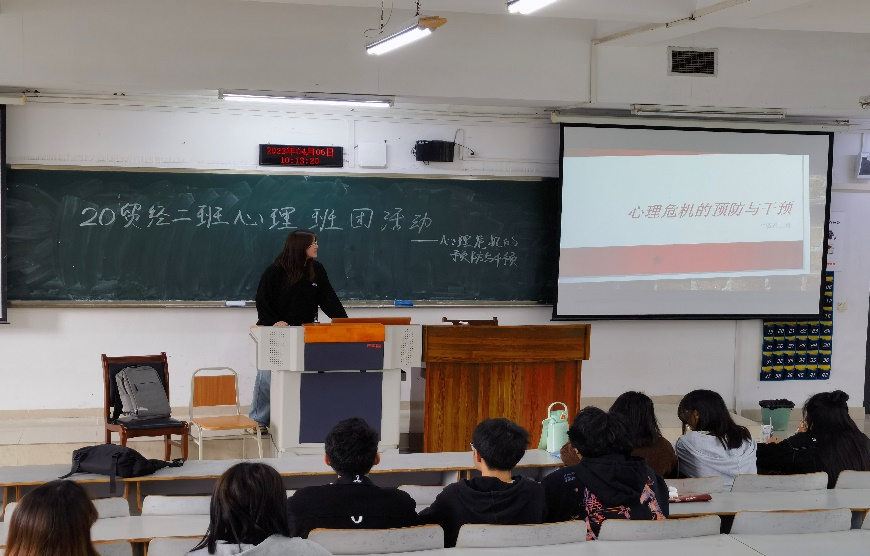 以21级财政二班、20级贸经二班为代表的一批班级开展了“心理危机预防与干预”心理主题班会。21级财政二班此次班会活动通过PPT解说、播放视频等形式展开。班会内容涵盖员工常见心理问题、心理健康判断标准、心理问题解决方法、人生价值取向导航等多个方面。班级内开展辩论、同学讨论。本次活动促进了同学们自觉维护自身的心理健康,建立自信,增强心理素质,在班级内营造了一种关注心理健康、重视心理健康的氛围,增强了班级凝聚力。同时也提高了同学们的心理健康知识水平,增强了同学们的心理保健意识,掀起了关注心理健康的热潮,真正让心理教育工作走进了班级。20级贸经二班在活动过程中采用提问和上台互动的方式提高同学们的参与度,同学们积极参与并上台展现自我,向大家分享讲述个人经历和感受,围绕着活动主题“心理危机的预防与干预”提出自己的观点和见解。此外,通过向同学播放经典优秀电影片段的方式展示心理成长历程、引向案例导入和措施传达。另外,部分同学也根据自己的经历提出了自己的方法和经验与大家分享。此次活动达到了给班级同学普及如何关注和了解,并适当进行调节自身情绪状态的相关心理健康知识,心理班团活动的举办召集大家在一起,同学之间分享自己的难处,互相帮助排忧解难,增强了班级的凝聚力和共情。