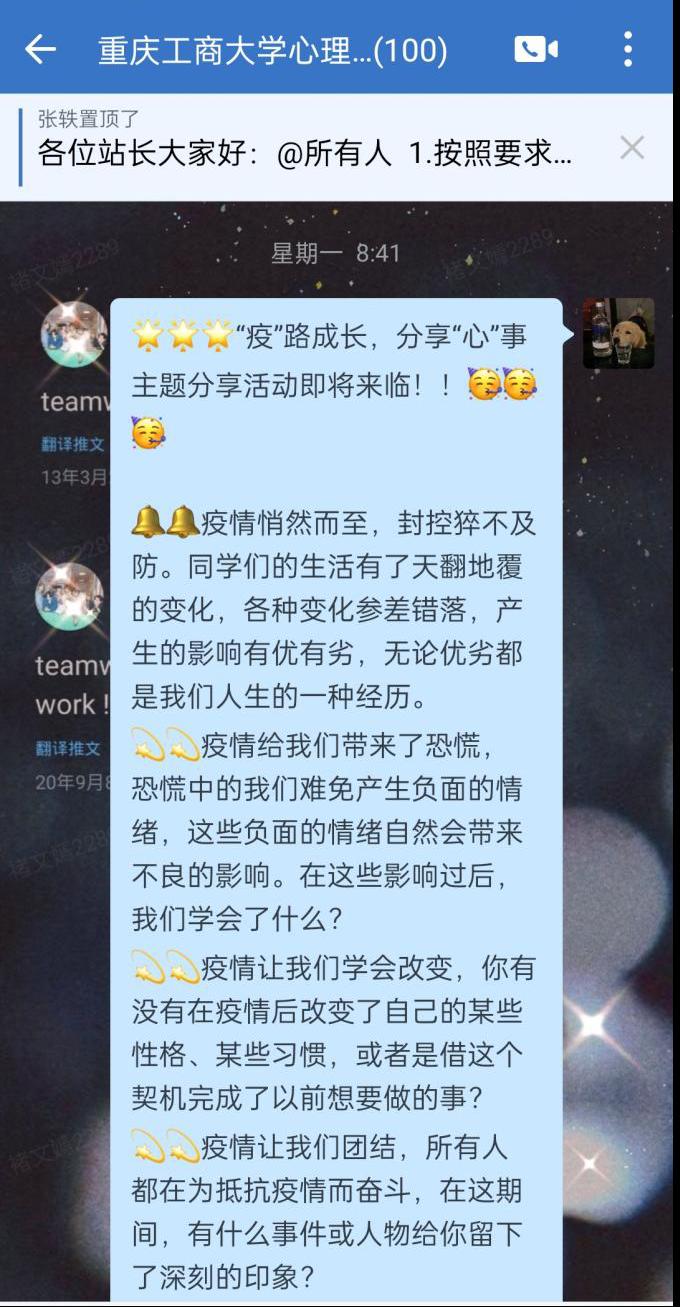 为进一步了解员工疫情期间的心理状态,缓解同学们因疫情期间产生的焦虑心情,伟德国际bevictor1946心理工作站于10月18日组织开展“疫路有你,分享心事”线上主题分享活动,向全体在校员工征集疫情期间印象深刻的故事或自身的心路历程。同学们积极参与,共计500余名同学参加投稿。