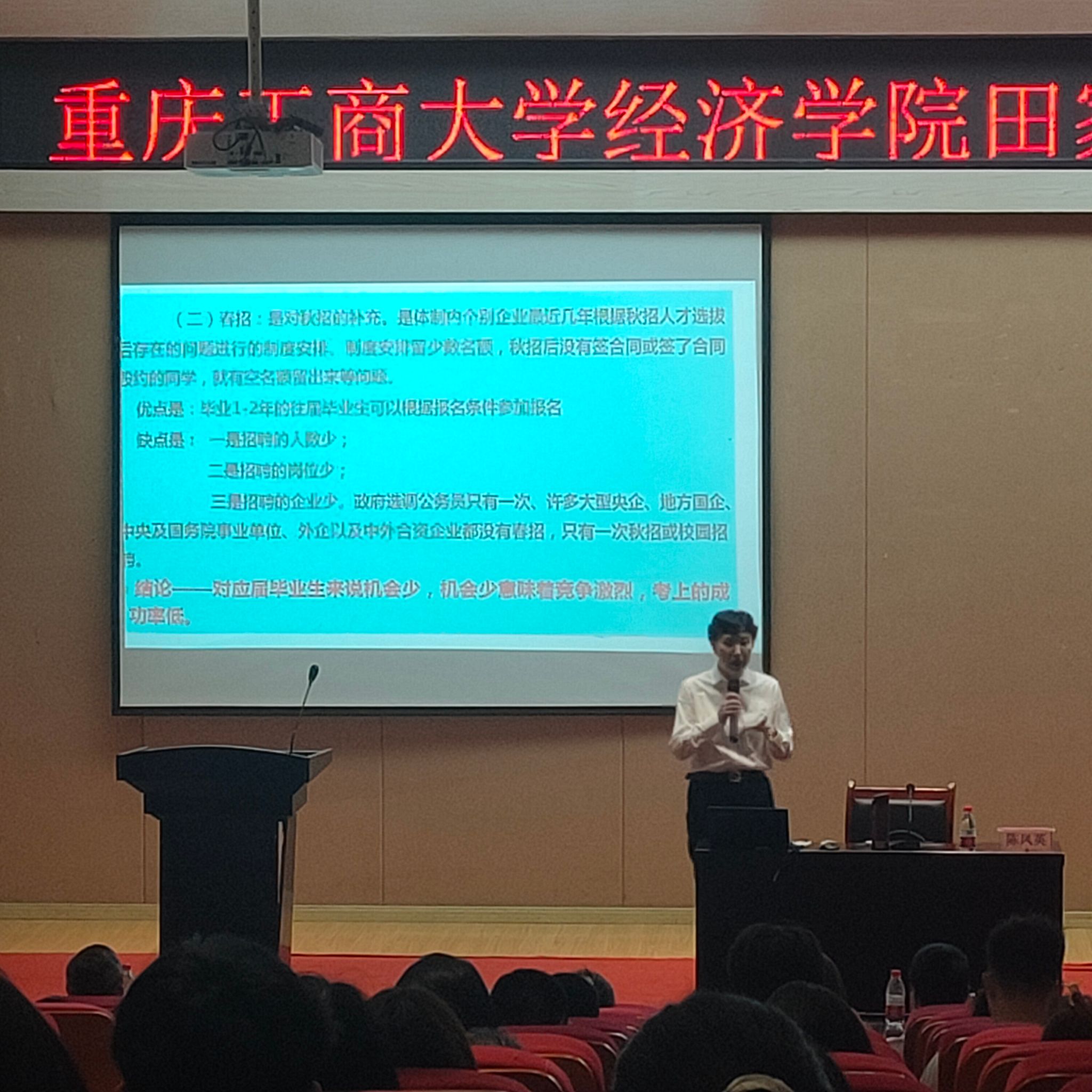 陈凤英从校园招聘对老员工的重大意义、重庆及全国市场校招情况、如何准备校园招聘考试、案例分享等四个方面,娓娓道来,深入浅出,帮助同学们厘清就业形势,了解就业政策,提升就业技巧。宋瑛经理最后给同学们做了就业动员,并在总结讲话中指出,产学研论坛是行业精英进校园系列活动之一,通过不断搭建行业精英进校园平台,请行业精英与同学们分享人生经历和经验,使同学们能够主动对接社会,提前锻炼好各项技能,为高质量就业做好准备。